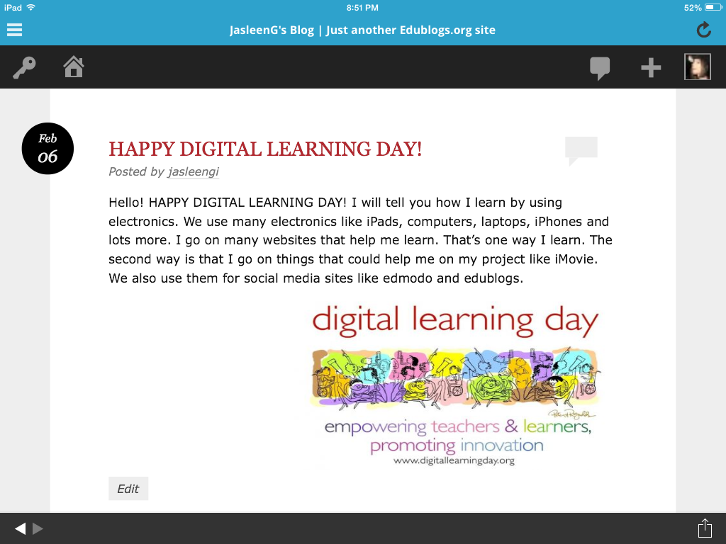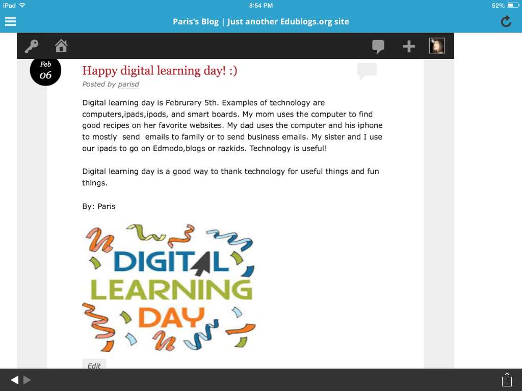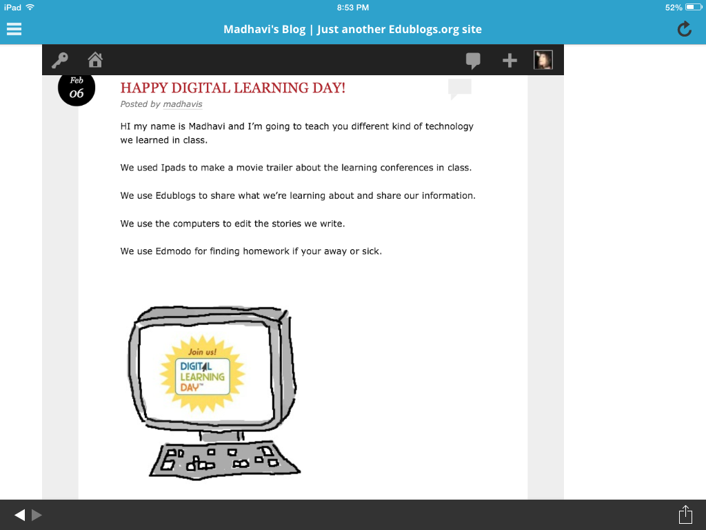 I’m lucky enough at my school to have a variety of technologies to use: ipads, laptops, smartboard, flip cams. Our day was filled with exciting activities that had the students actively learning new things. Close to the end of the day, a student asked me if they could blog about what Digital Learning Day is, so I of course gave everyone some time to type an entry. Here are a few examples.