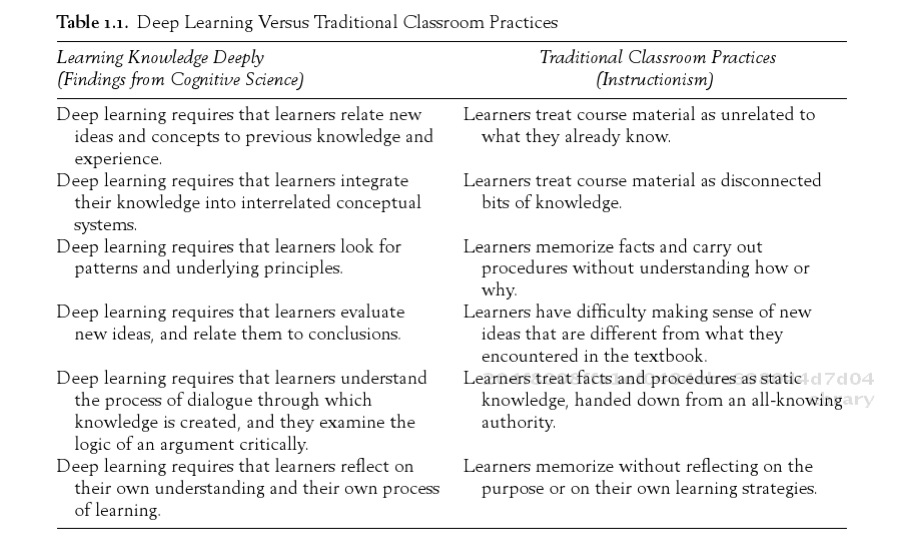 In chapter two, Sawyer discussed explicitly about instructionism verses research from the cognitive sciences, as shown in the image below: