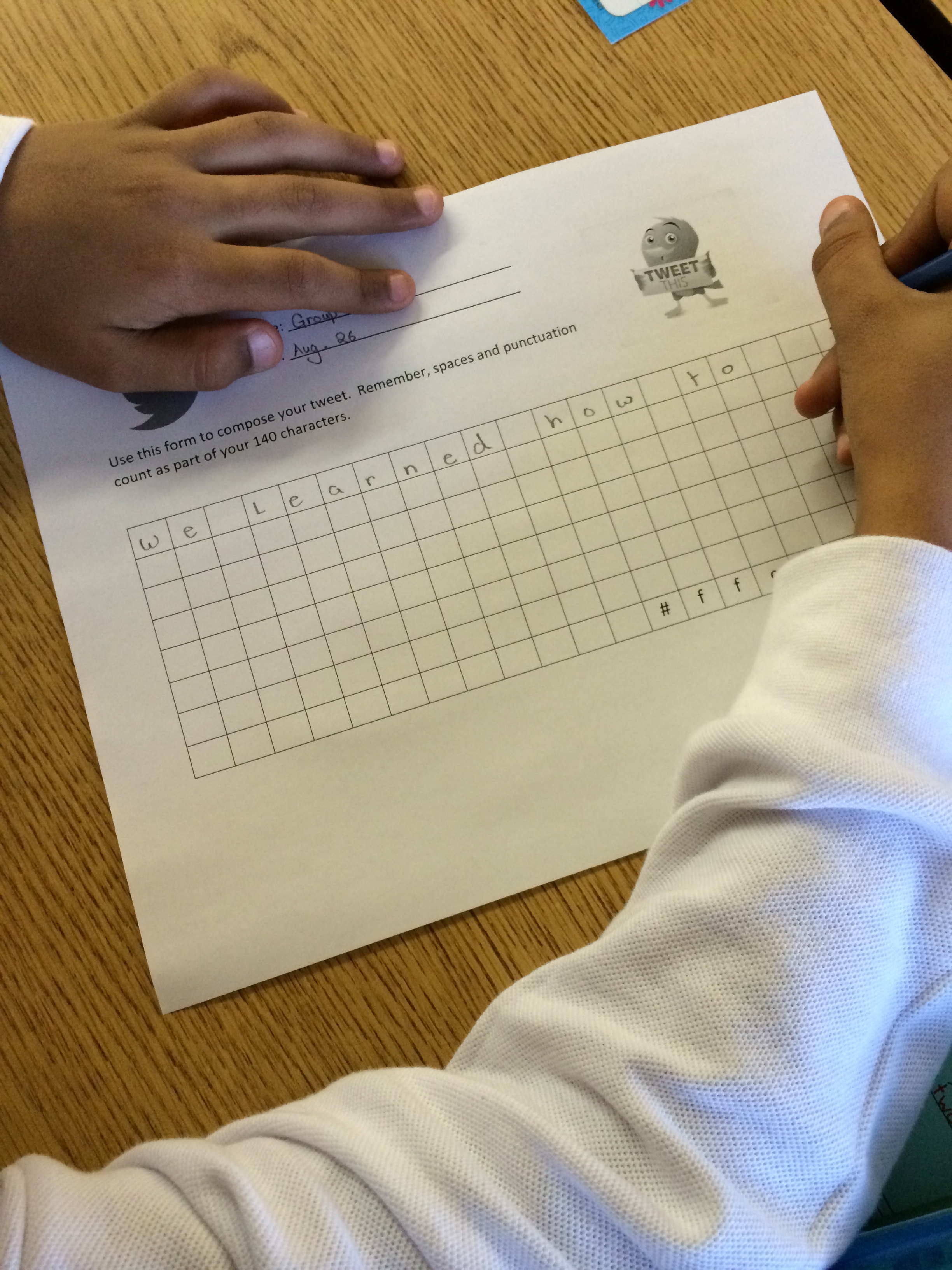 The Process: I opened our class twitter account on the smartboard, gave a quick low-down on what twitter is and our account, and then began to explain how to tweet. For our first tweet, I wanted the students to work together in their groups to collectively figure out how they would decide what to tweet and come up with a precise 140 character phrase. I provided them with this tweet form as a way to organize their thoughts.