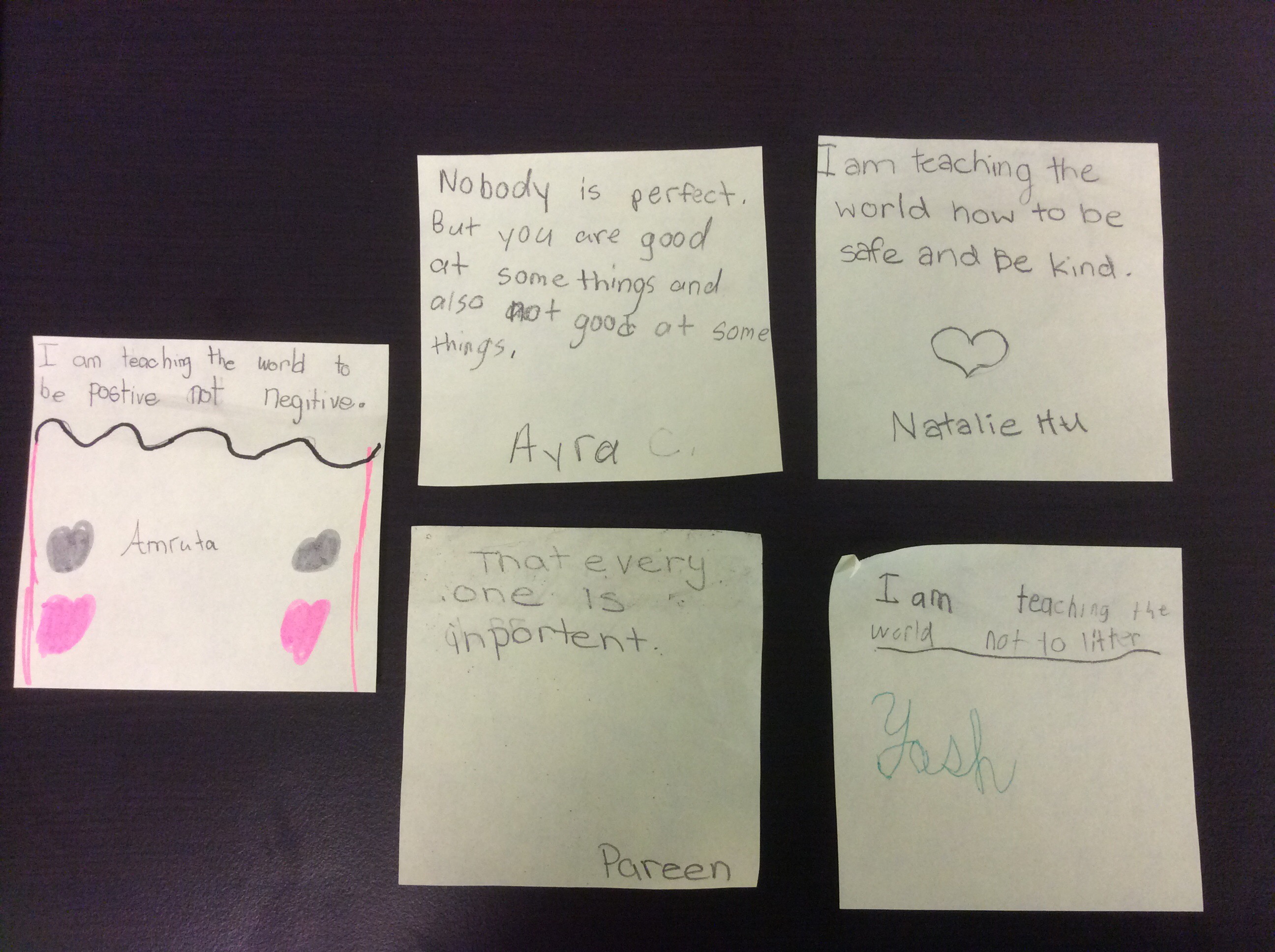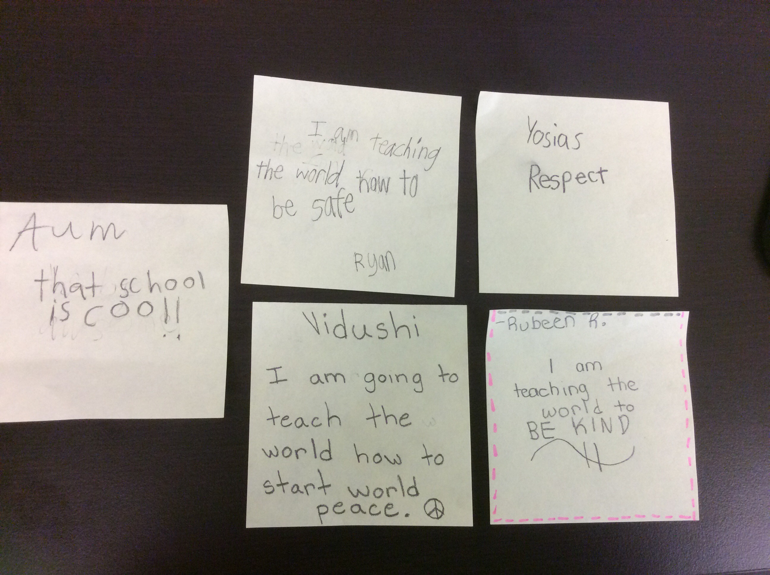 At the end of the video, Kid President poses the question, “What are you teaching the world?” Together we talked about what this might mean, and the potential legacy that we can choose to leave behind. I gave students time to reflect independently, and then passed them each a sticky note to share their personal ideas and to answer the question in their own words. Here are some of their responses: