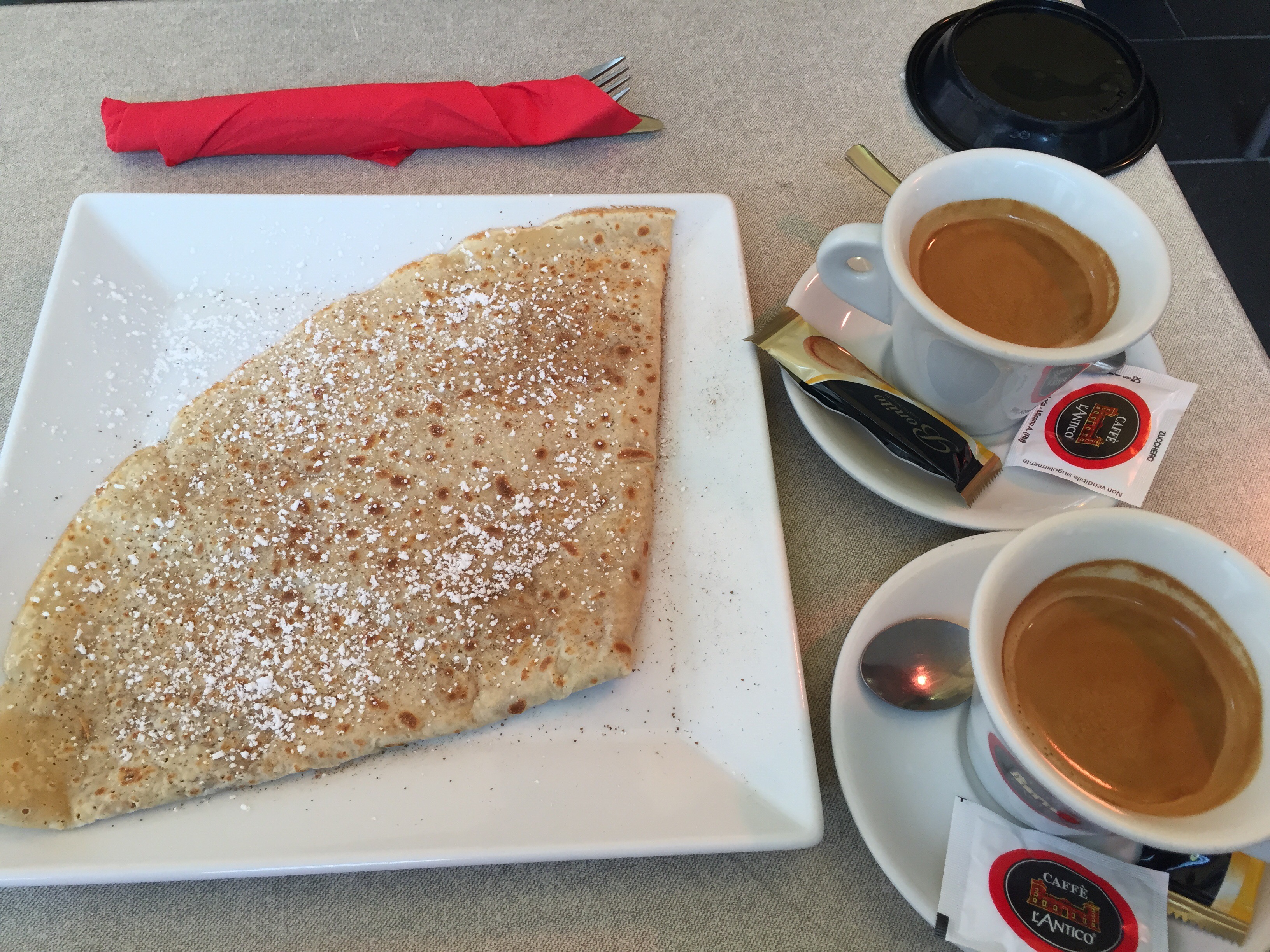The rain continued to pour, so after a visit to the cathedral, we stopped for an essential coffee and our first crepe!