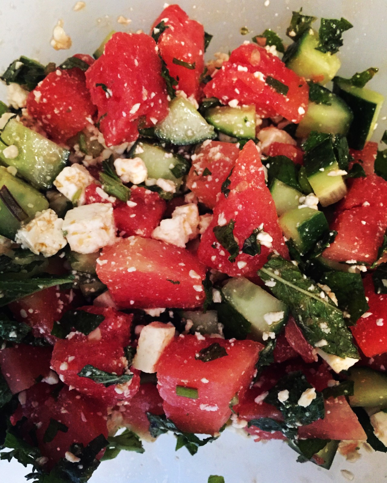 My mom stopped by our house the other day, noticed a watermelon sitting on the counter, and said we should turn it into a salad. “A salad?” I thought out loud, to which she replied, “Yeah, just add some feta.” I don’t know why I ever question my mom’s cooking abilities because she could run her own restaurant, but this idea did sound a little bizarre to me. Turns out, with some makeshift ingredients, I created quite the masterpiece that I’d love for others to try.