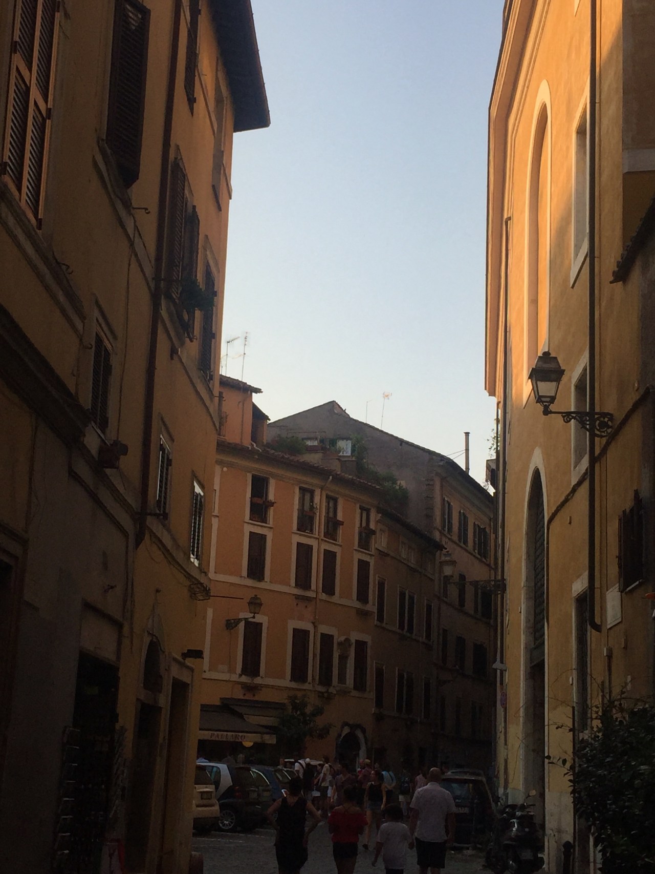 Once we were cleaned up and ready, we headed out to find our bearings in our new setting. We’re staying in a hip little part of Rome on the south side of the river called Trastevere, which literally means behind the river. It’s a medieval neighborhood that has strong working class roots, but is filled with traditional trattorias, artisan shops, and beautiful plazas.