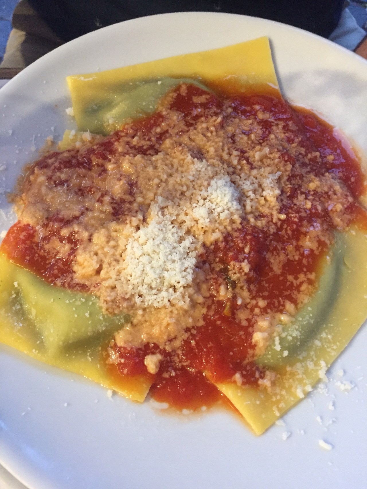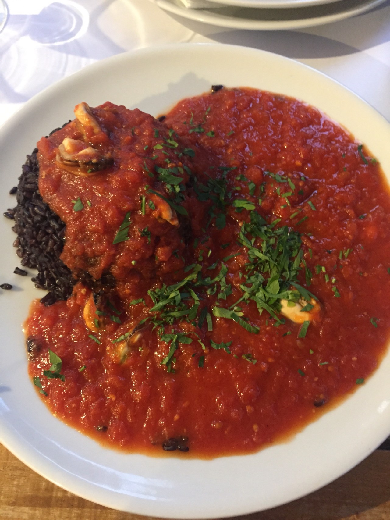 For our mains, I had a black rice and mussels dish, and Daniel had the Roman ravioli. We washed it all down with a local, tasty red.