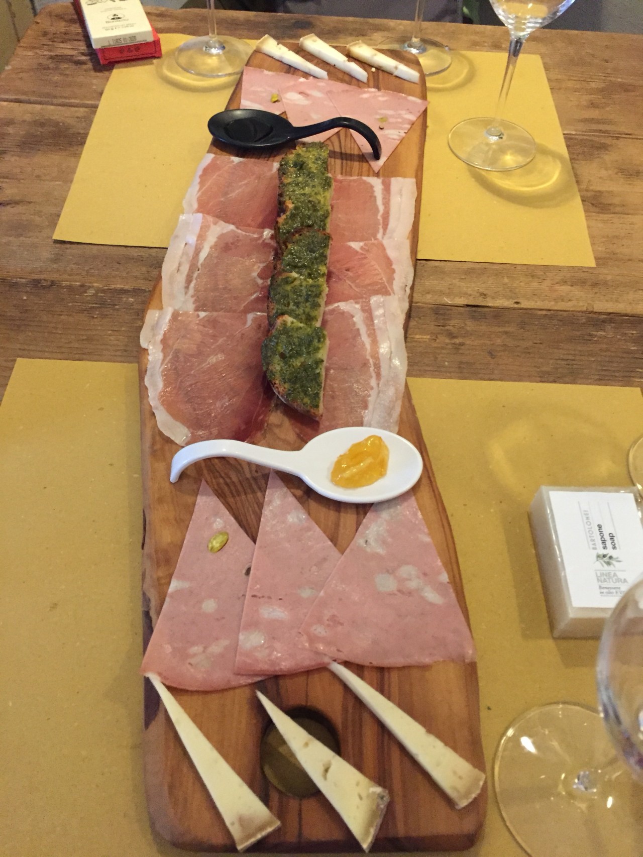 We continued our tour to a place called Masto. This is a small, trendy bar where we had a Veneto wine and tasted some cheese and meats. The tray we received consisted of a cheese that was a young, 20 day aged cheese with walnuts, a bologna meat with pistachio, a bassiano prosciutto, and a bruschetta. We also had some sea salt chocolate.