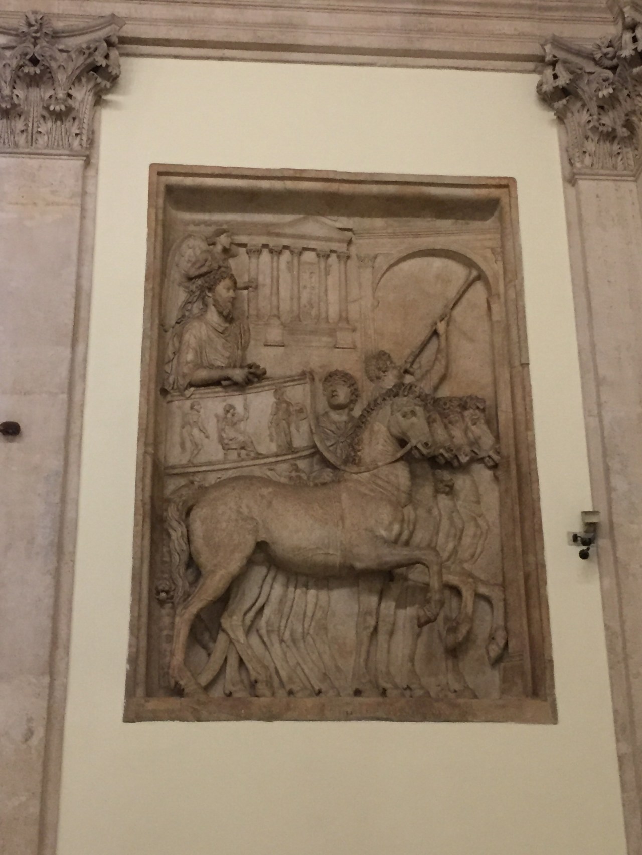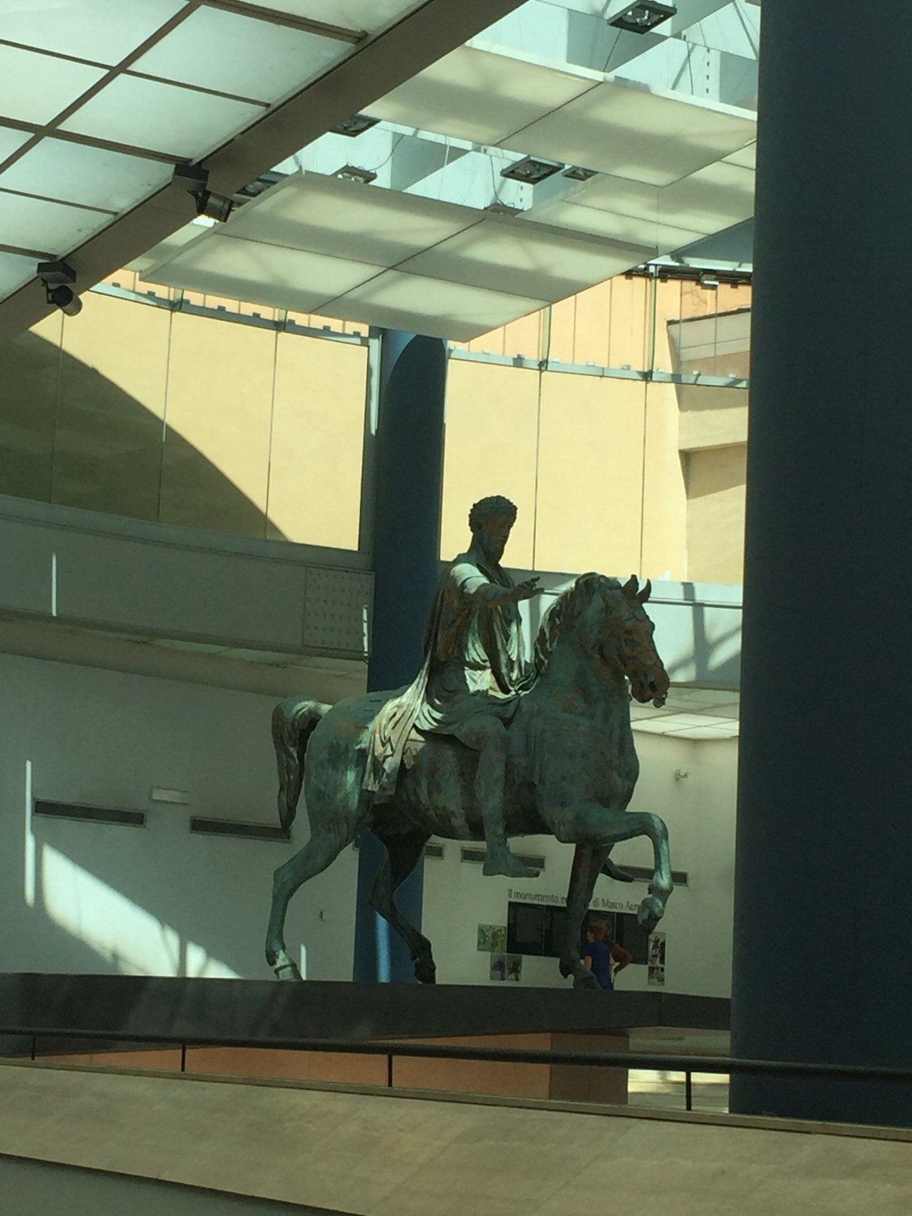 Finally, of particular interest to me was the original but restored statue of Marcus Aurelius on a horse. This is the greatest surviving equestrian statue circa 173 C.E. The bronze statue stands over 4m high.