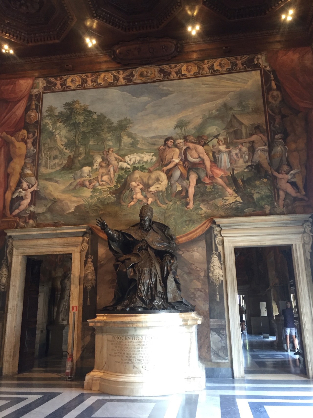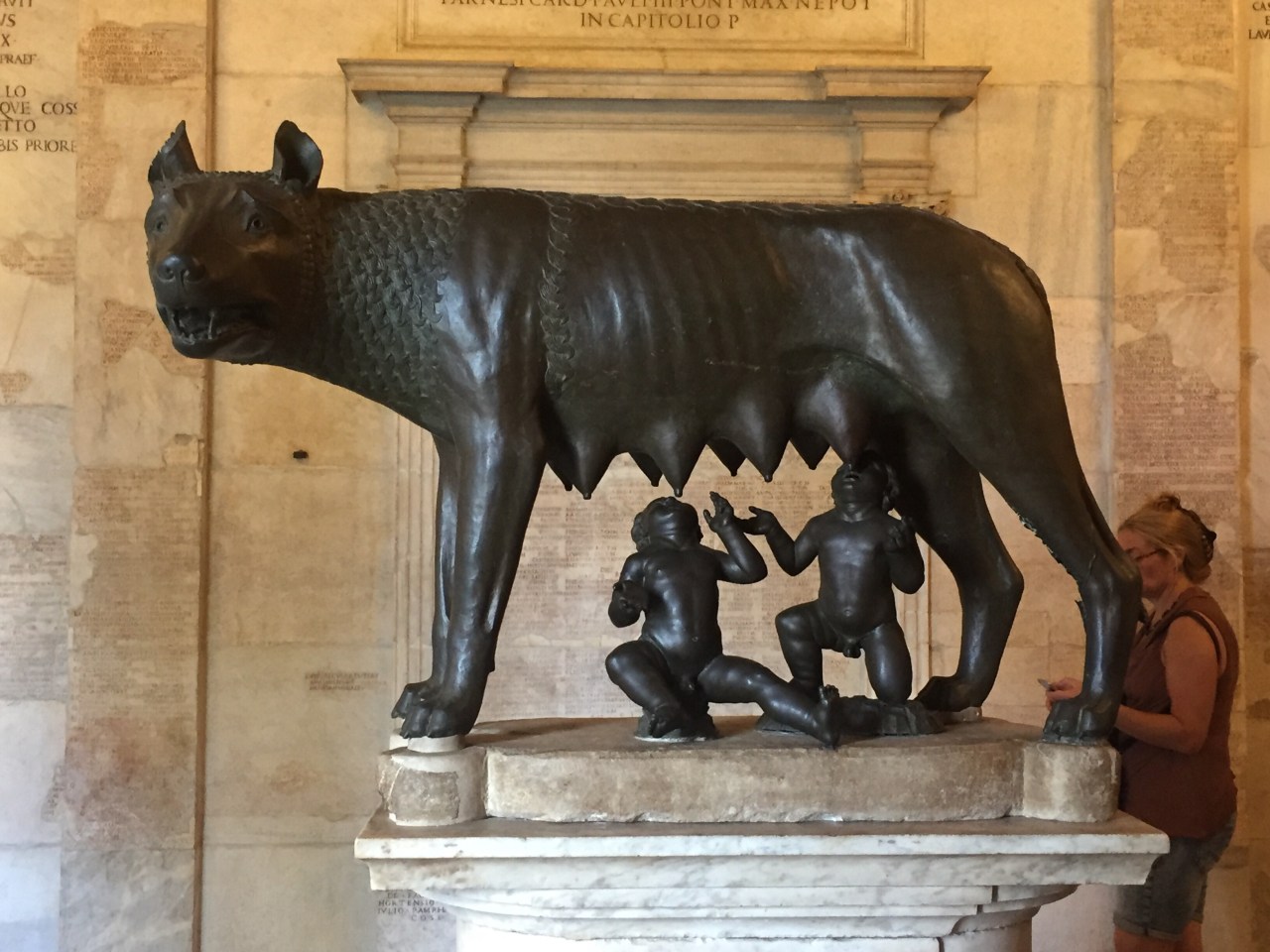We spent hours in this place admiring the history, statues, art work, and portraits. Of particular interest to me was the Capitoline She-Wolf. According to Roman mythology, the city’s founders, twins Romulus and Remus, were abandoned on the banks of the Tiber River when they were infants. A she-wolf saved their lives by letting them suckle.