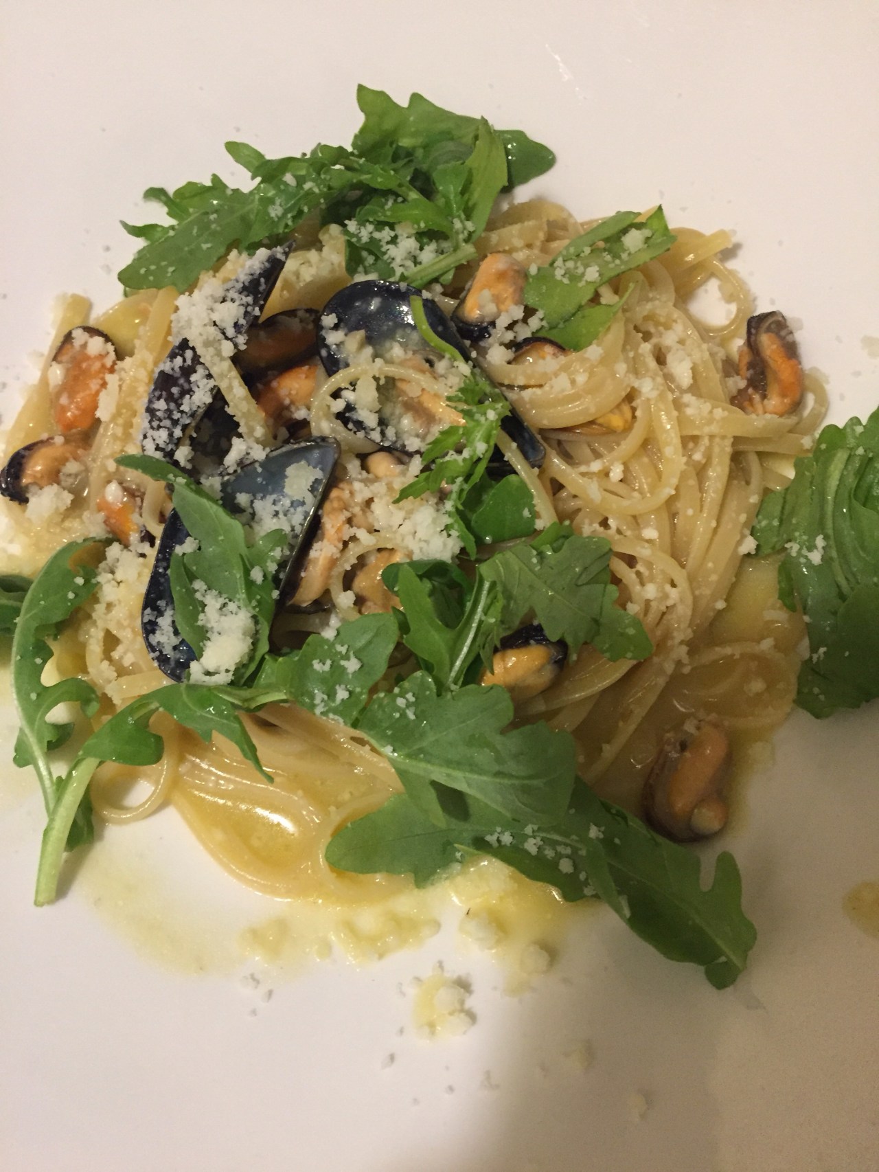 Next, Daniel had the tomato sauce pasta with the insanely delish “bacon” and I had the white pasta with mussels.