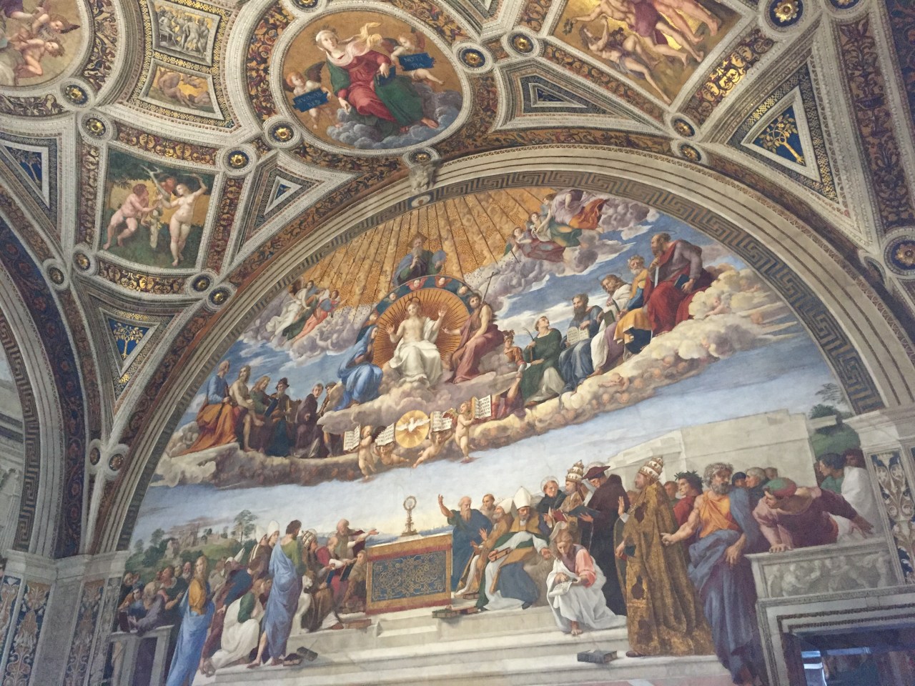 Another impressive series of rooms were the Raphael Rooms. Pope Julius II commissioned a then young Raphael to decorate four rooms to outdo his predecessor. The first composition was the Disputation of the Holy Sacrament in 1509, where he created an image of the church both on earth and in heaven.