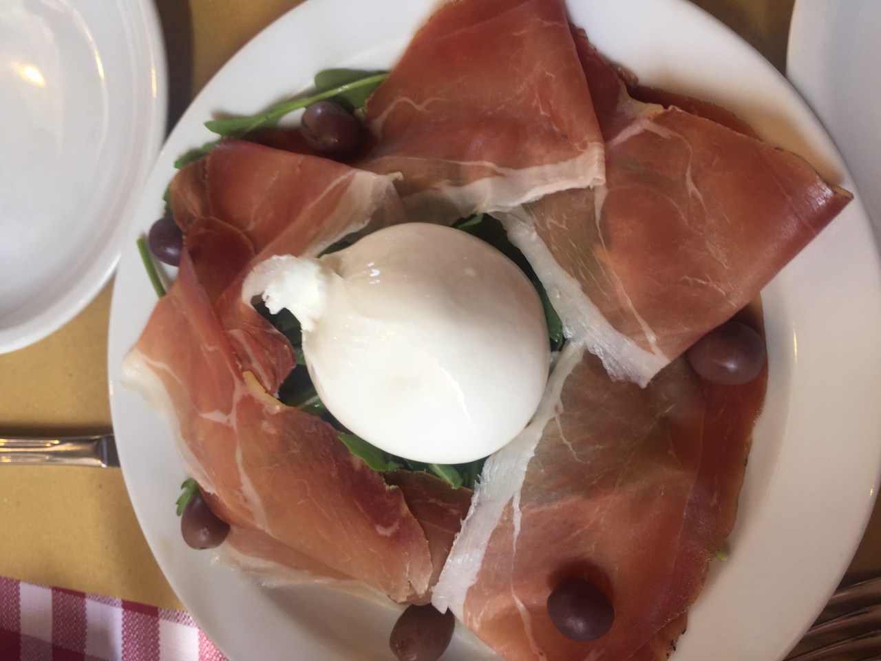 By this point, it was fairly late and about time for us to start thinking about lunch. We walked back across the river and settled for a place off of Plaza Navona. We began our lunch with some burrata cheese, prosciutto, and olives.