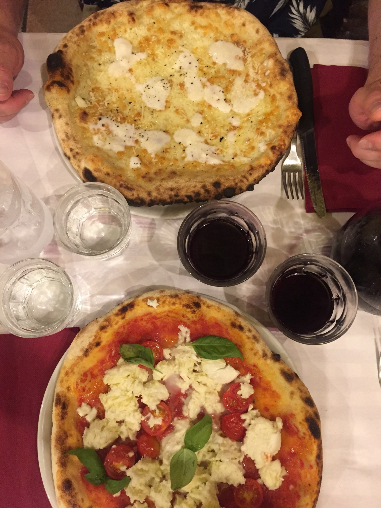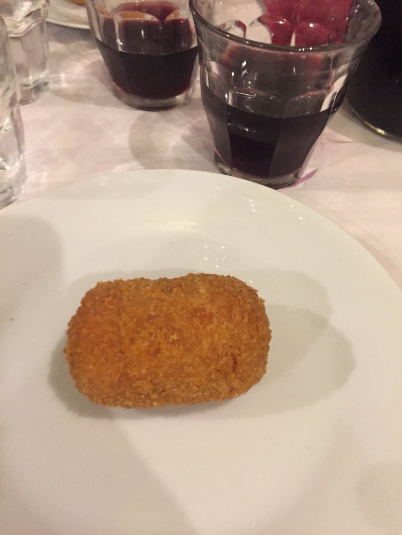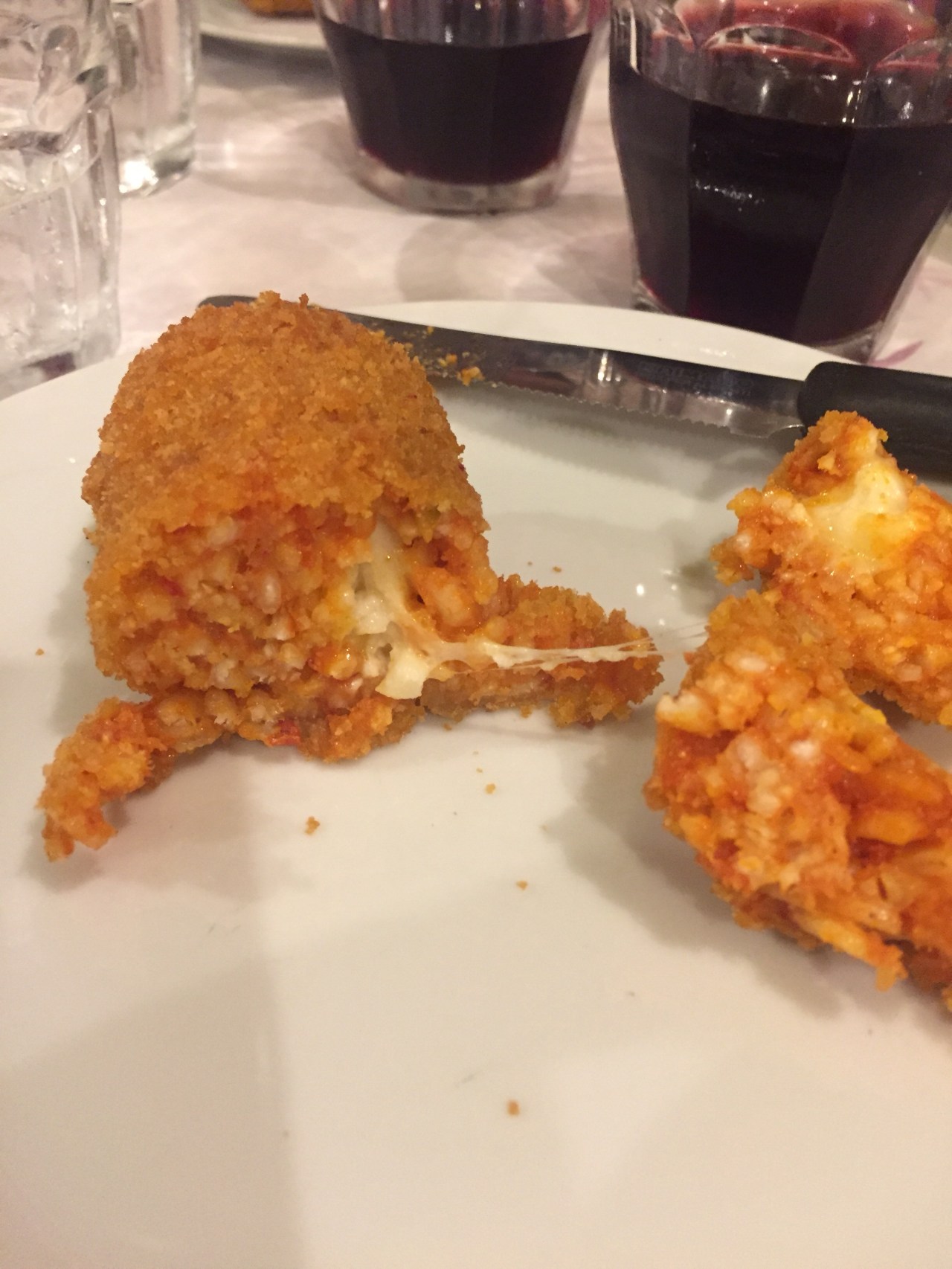 Tonight we decided upon a place in our Trastevere community. On our food tour, we learned that it’s common to eat pastas for lunch, as the wood burning ovens aren’t started until dinner time. We’ve been adopting this custom to have pasta for lunch, and save the pizza for dinner. We went to a tasty place called Dar Poeta. We began with the classic street foos, supplí.