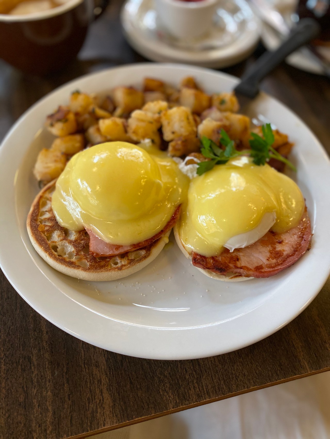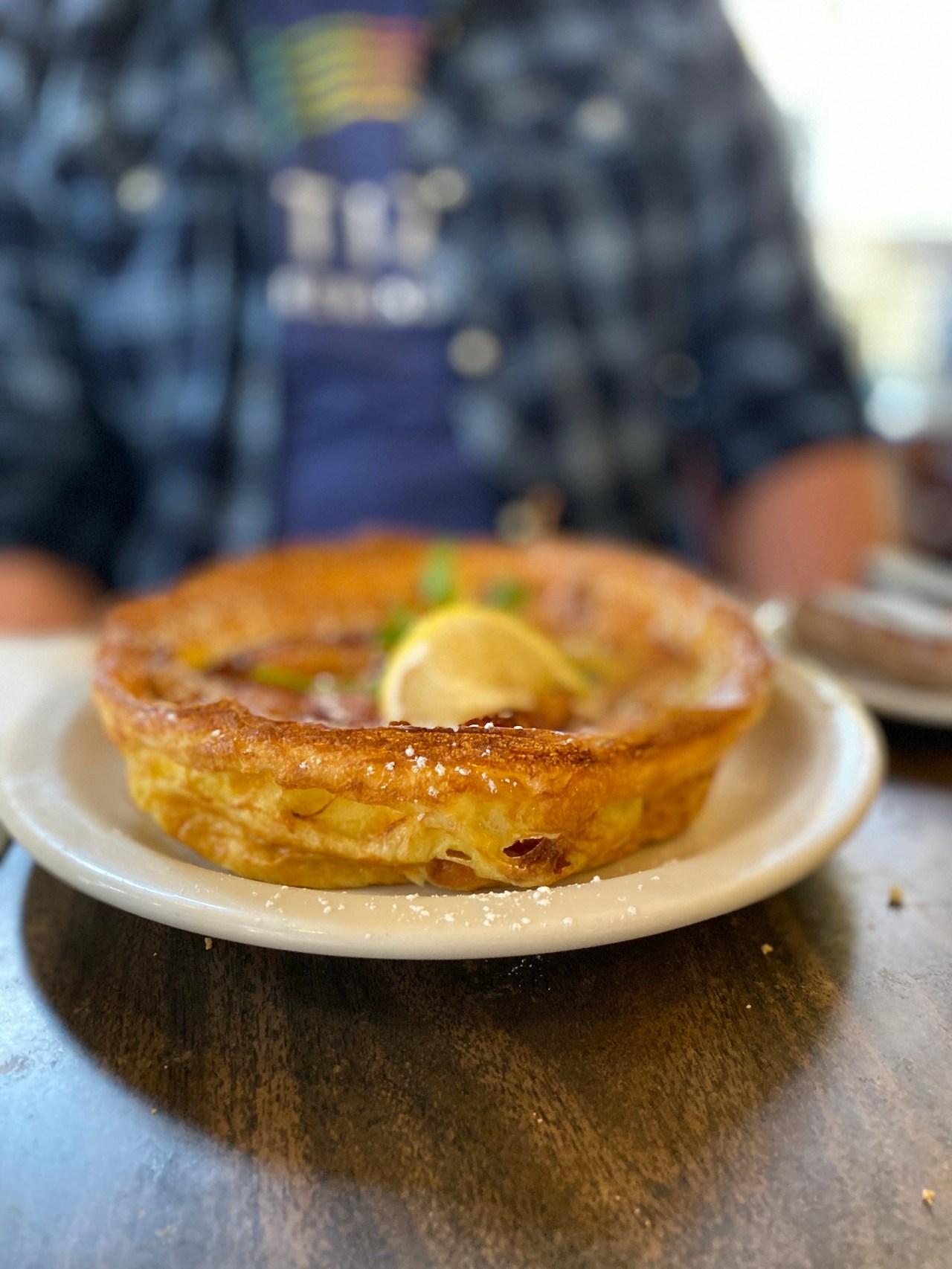Once we were seated, we were given complimentary scones and jam, as we studied the menu and decided what to order. Our server recommended both the German pancakes and the eggs benny, so it only seemed right to order both. I love a good eggs benny, and I definitely loved this one. It looks simple on the outside, but this was probably the best hollandaise sauce I’ve ever had. It was so creamy and buttery. The apple German pancake was a lovely sweet option. The apples were caramelized with cinnamon sugar and then baked with the batter on top. This was a dish I would definitely order again!